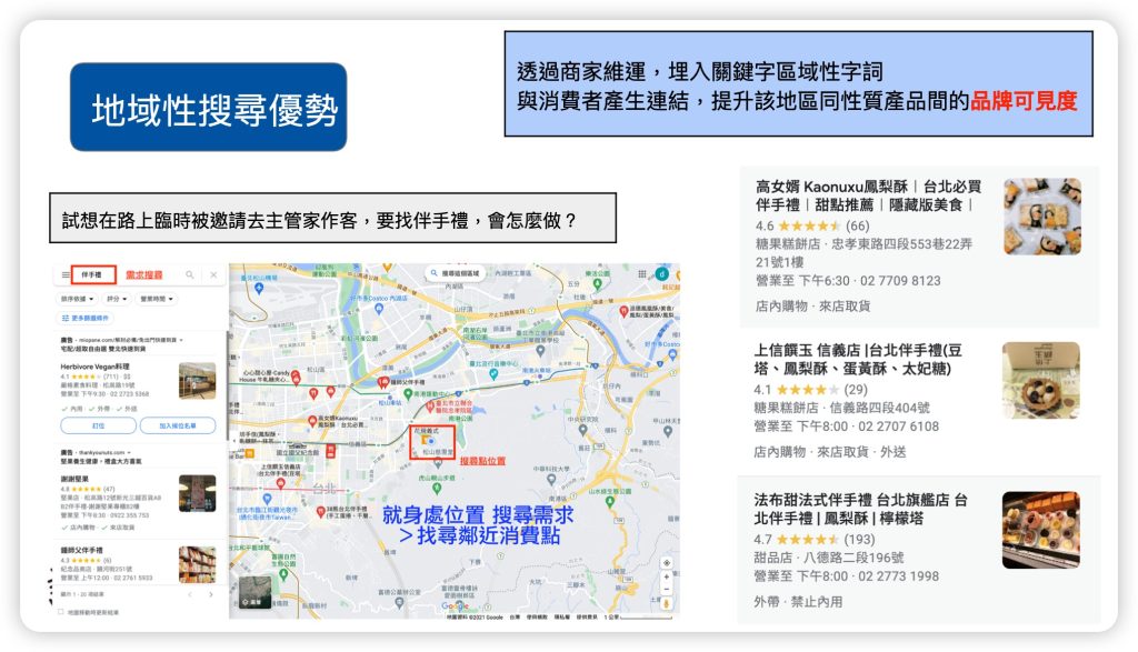 透過商家維運,埋入關鍵字區域性字詞,與消費者產生連結,提升該地區同性質產品間的品牌可見度。